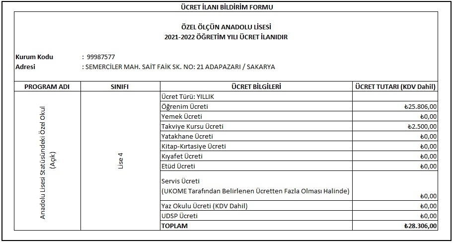 Özel Ölçün Anadolu Lisesi olarak, 2021–2022 eÄŸitim öÄŸretim yılına iliÅŸkin 9, 10, 11 ve 12. sınıf öÄŸrenim ücretleri, Milli EÄŸitim Bakanlığı Özel ÖÄŸretim Kurumları YönetmeliÄŸi ve Bakanlığımız tarafından ilan edilen resmî zam oranları esas alınarak belirlenmiÅŸtir.