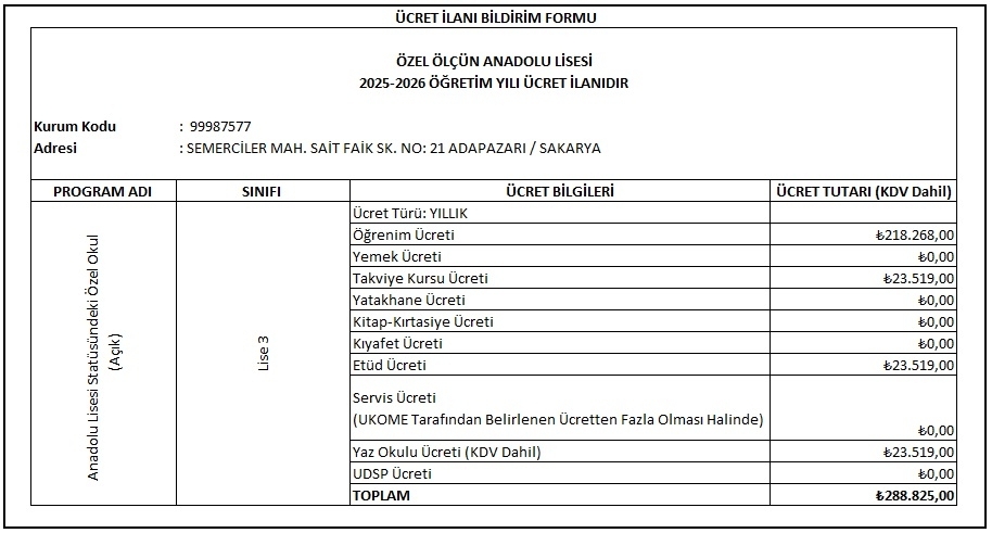Özel Ölçün Anadolu Lisesi olarak, 2025–2026 eÄŸitim öÄŸretim yılına iliÅŸkin 9, 10, 11 ve 12. sınıf öÄŸrenim ücretleri, Milli EÄŸitim Bakanlığı Özel ÖÄŸretim Kurumları YönetmeliÄŸi ve Bakanlığımız tarafından ilan edilen resmî zam oranları esas alınarak belirlenmiÅŸtir.